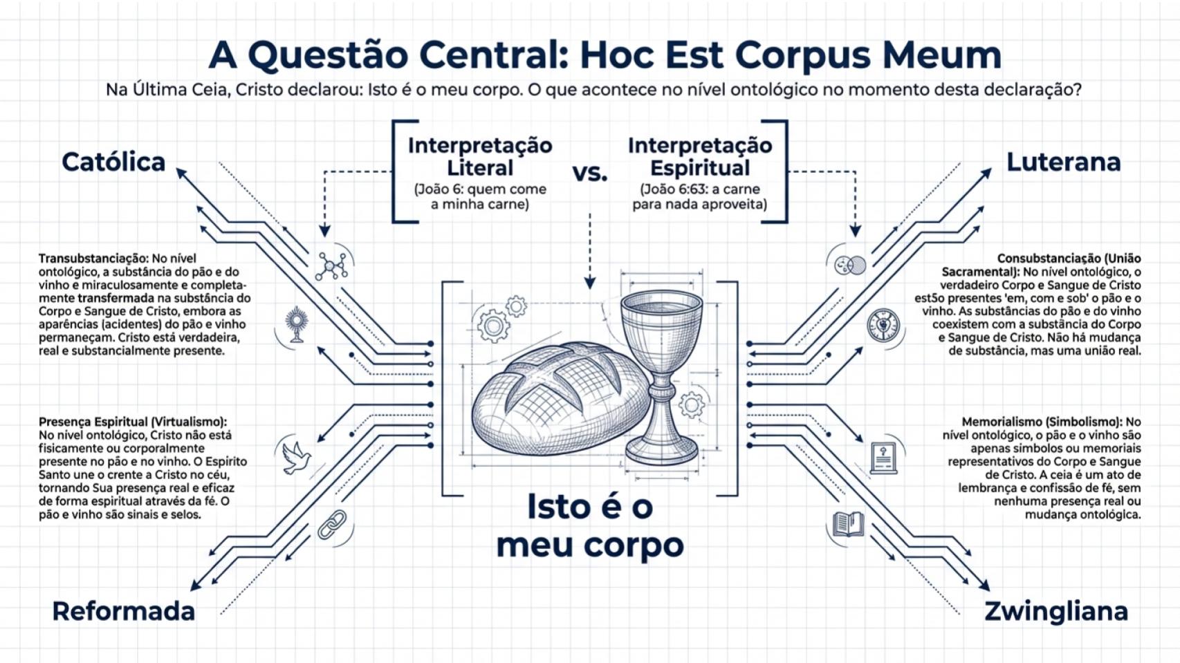 A controvérsia eucarística é uma das mais complexas porque envolve divergências internas também dentro do protestantismo. O espectro vai da transubstanciação católica (mudança real de substância) à visão memorial zuingliana (puro símbolo), passando pela consubstanciação luterana (presença real junto aos elementos) e pela presença espiritual calvinista (Cristo presente espiritualmente pelo Espírito Santo). Historicamente, este tema dividiu não apenas católicos e protestantes, mas os próprios reformadores entre si — o Colóquio de Marburgo (1529) entre Lutero e Zuínglio fracassou justamente por causa da Eucaristia. A discussão exegética centra-se na interpretação de João 6 e das palavras da instituição. A questão filosófica sobre substância e acidentes remonta a Aristóteles e foi formalizada por Tomás de Aquino no século XIII.